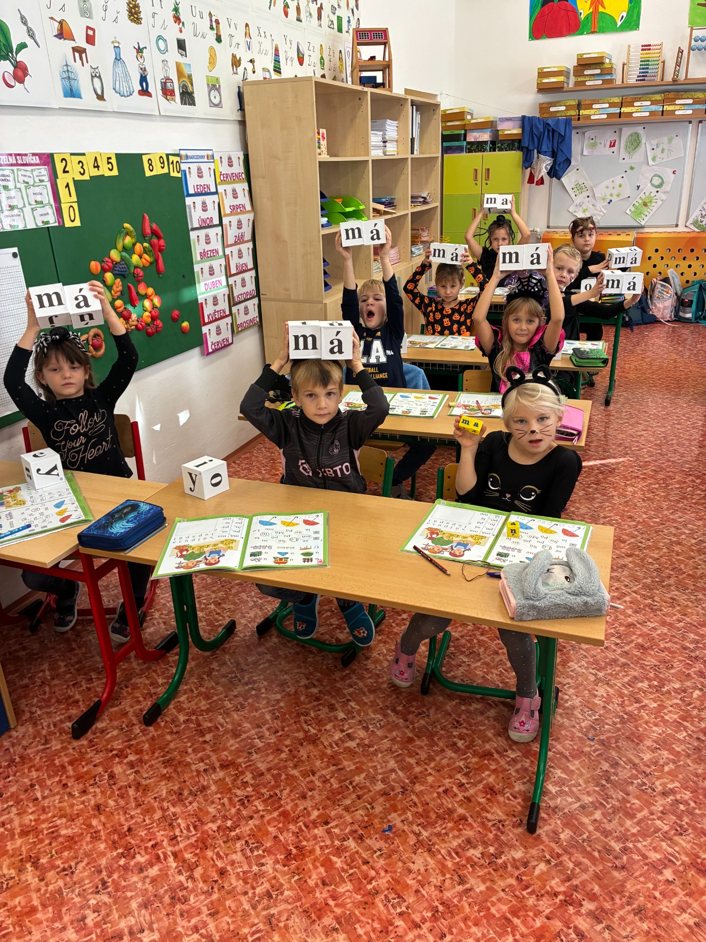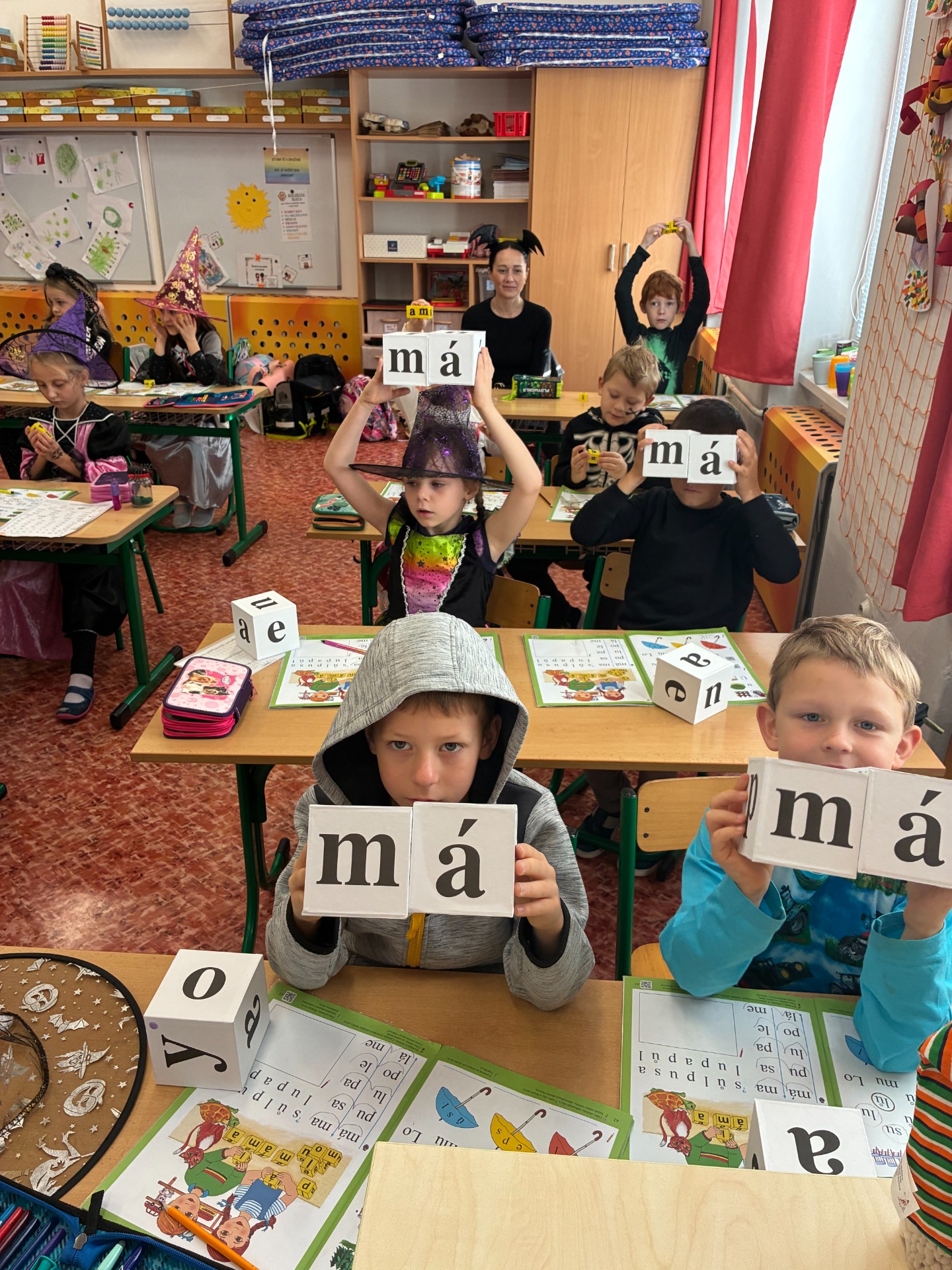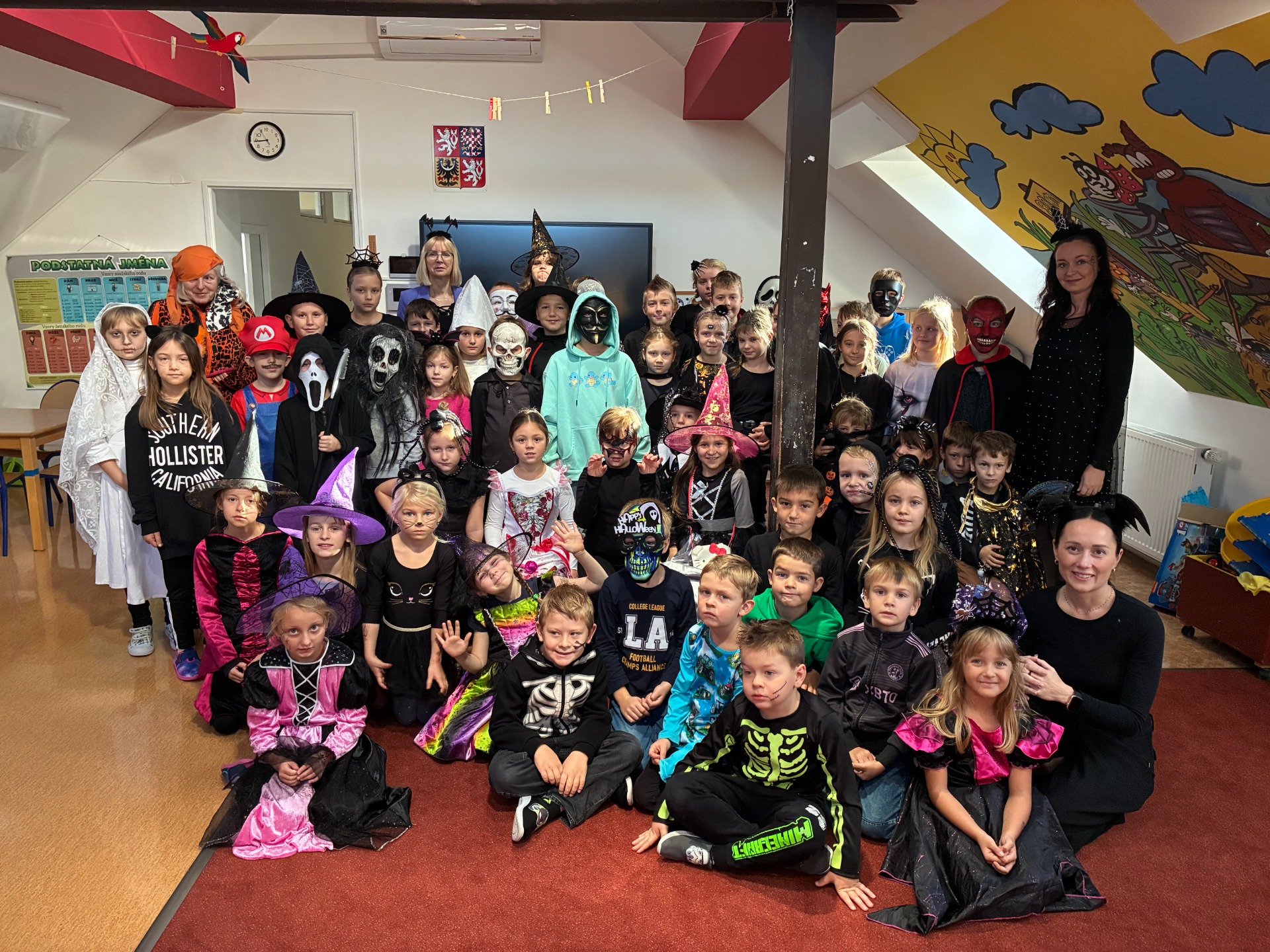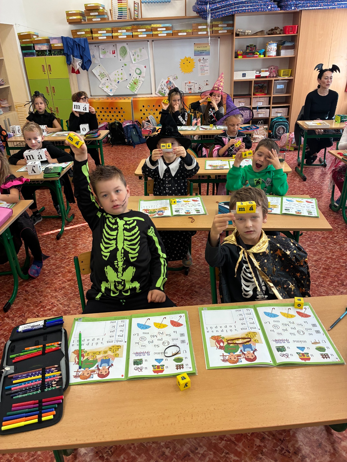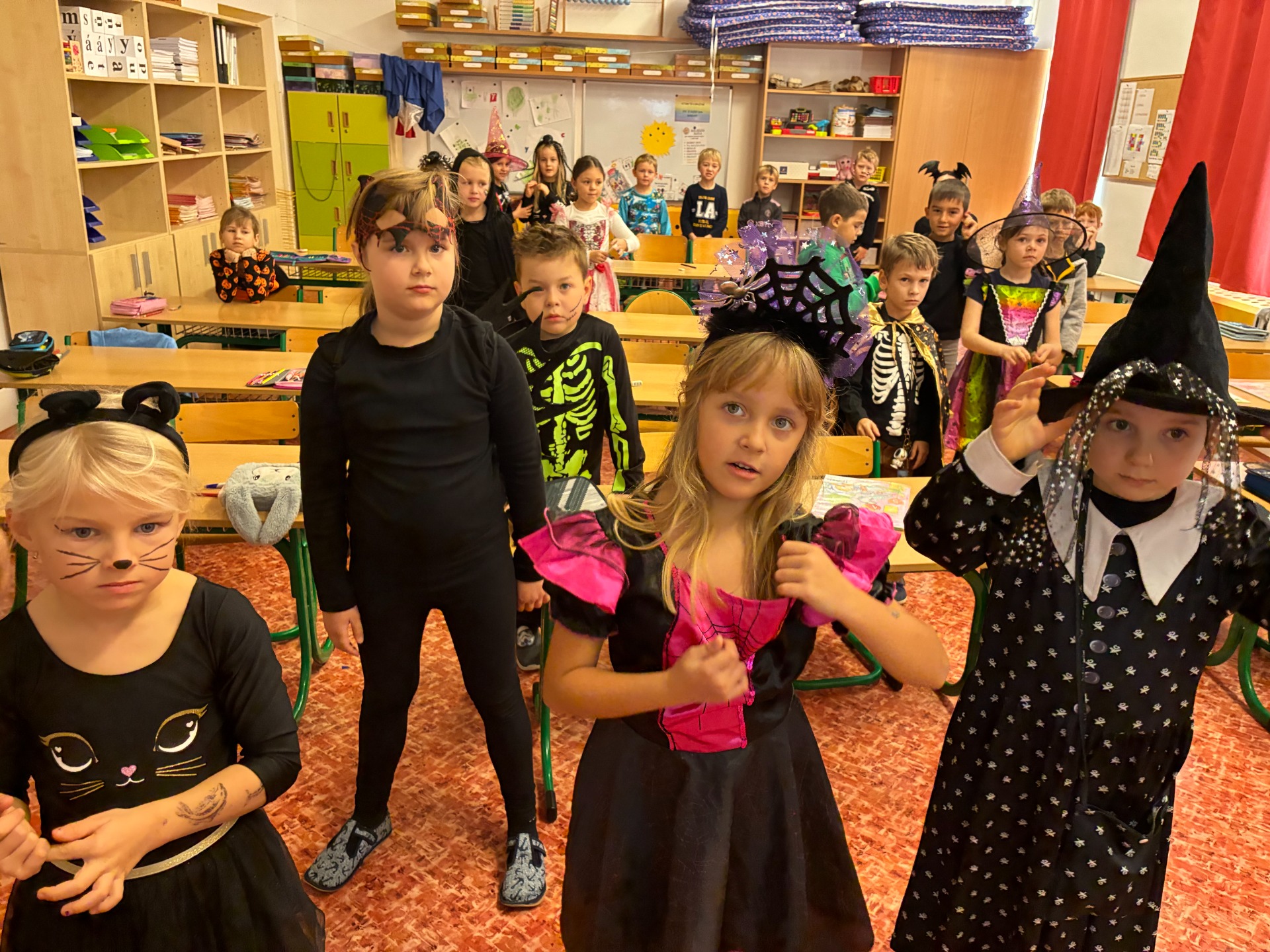 Dnešní čarodějné učení nás všechny moc bavilo! Všichni – žáci i paní učitelky – se převlékli za čarodějnice a černokněžníky, a fantazii se opravdu meze nekladly. Ve třídě se objevily klobouky, košťata, kouzelné lektvary i tajemné knihy kouzel.