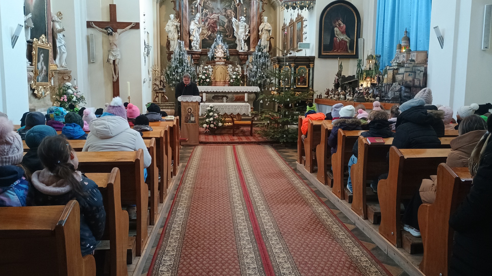 V kostele jsme obdivovali i krásný betlém, sváteční výzdobu a naposled si společně zazpívali vánoční koledu za doprovodu varhan. Na závěr mohly děti potěšit drobnou korunou i sošku černouška, která jim děkovně pokyvovala.