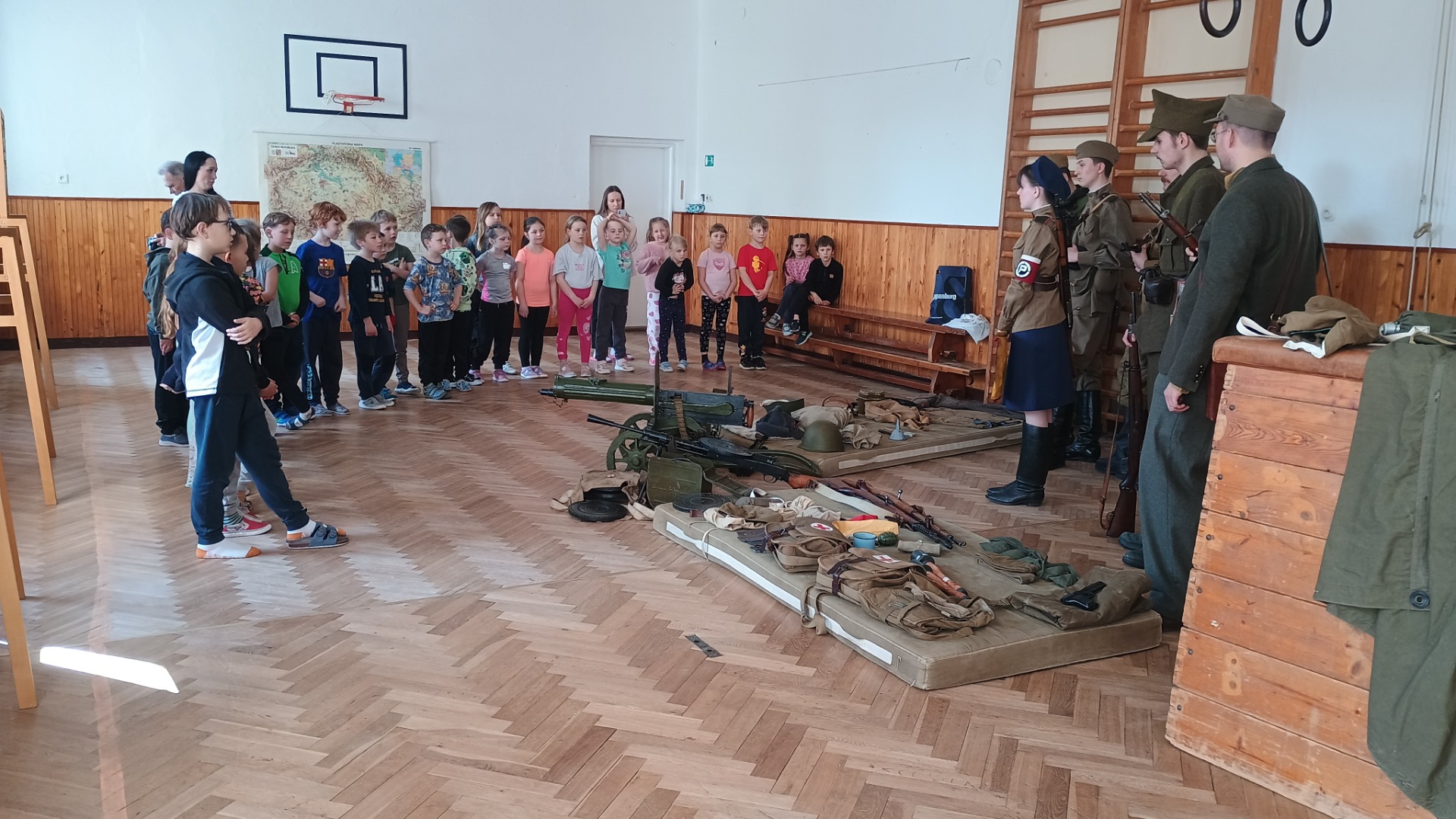 V tělocvičně školy si děti mohly zblízka prohlédnout, osahat a vyzkoušet nejrůznější vybavení vojáků z období druhé světové války - od pušek a pistolí přes bodáky a granáty až po dobové uniformy a další výbavu. Členové Klubu dorazili v dobových uniformách, čímž ještě více přiblížili atmosféru doby.