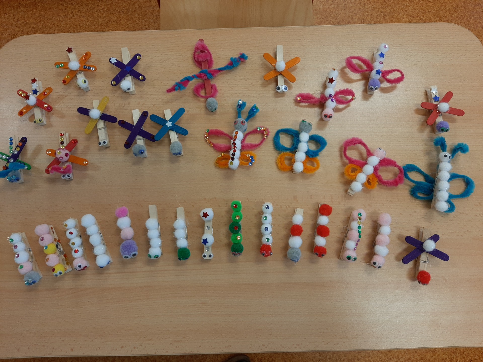 V dnešních Šikulkách jsme se pustili do tvoření z kolíčků na prádlo a střapatých kuliček - vznikly barevné housenky, poletující vážky i veselí motýlci.