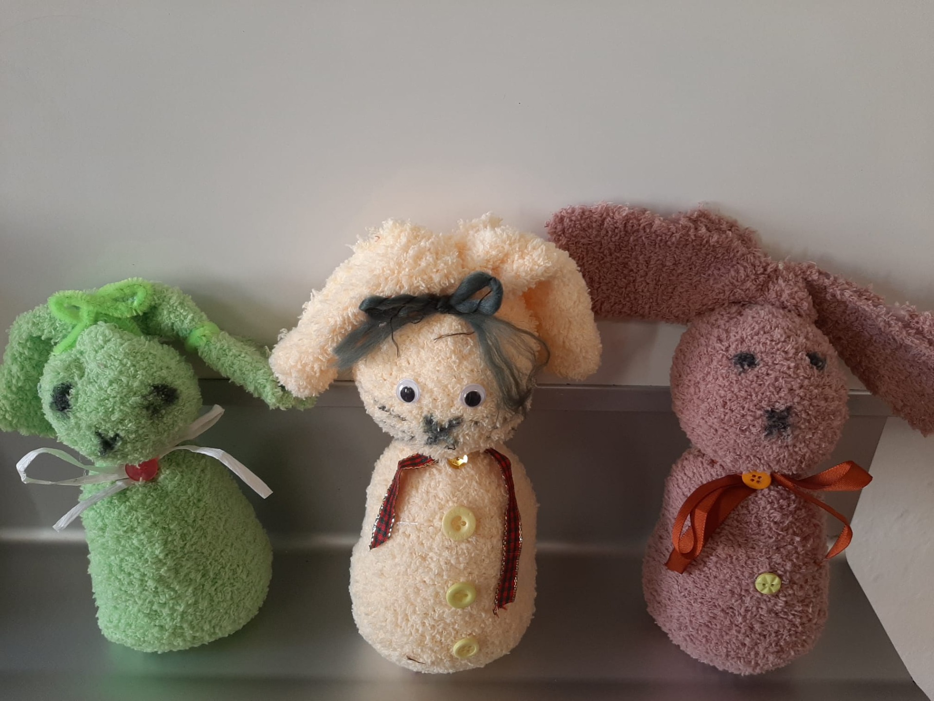 Ponožky, knoflíky, ohebné drátky, barevné mašličky... a máme plyšové zajíčky.